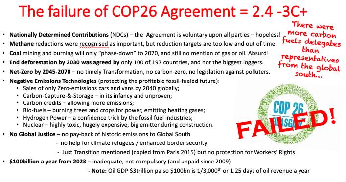 To sum-up the failure of COP26, listen to Greta Thunberg: 2.4°C if all governments met the 2030 targets, the world will still reach an average of 2.7°C with current policies. Also, these voluntary “Nationally Determined Contributions” (NDC’s) are based on flawed and underreported numbers. And this is IF leaders meet their promises, which judging by their track record is not very likely…This is what some seem to celebrate at the end of COP26. ”Glasgow has a credibility gap between talk and action. If all govts met their 2030 targets, we would have 2.4˚C of warming in 2100. But right now, current policies put us at 2.7˚C or more”. Read more here