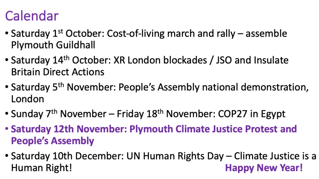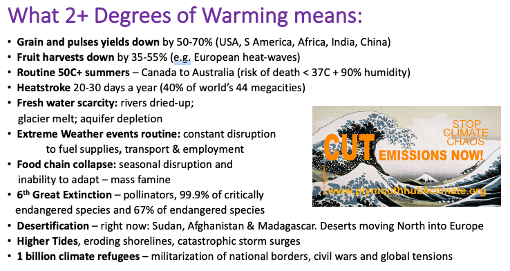 In Plymouth we bring together all environmental and climate activists for consideration of the science, discussion and debate, action planning and determination to push for real emissions reduction and system change.