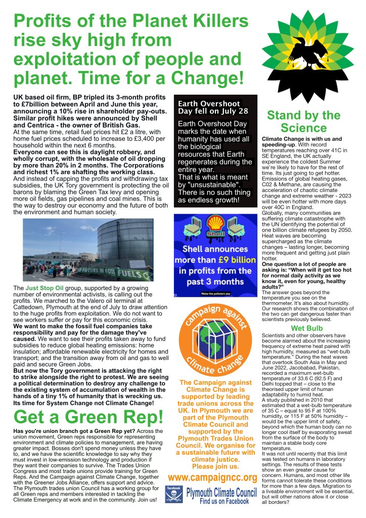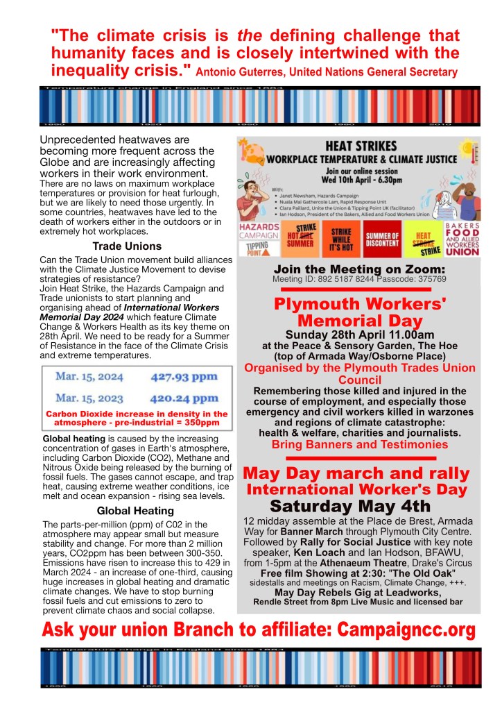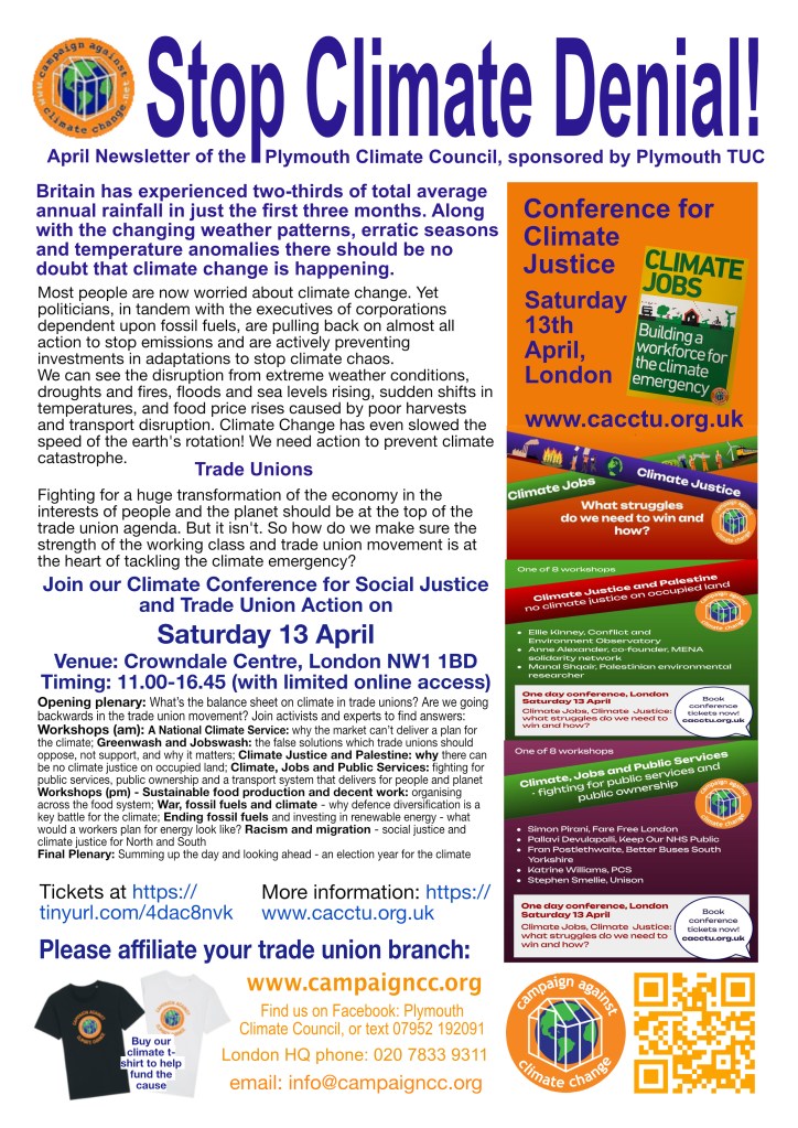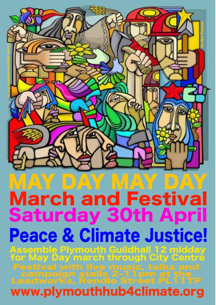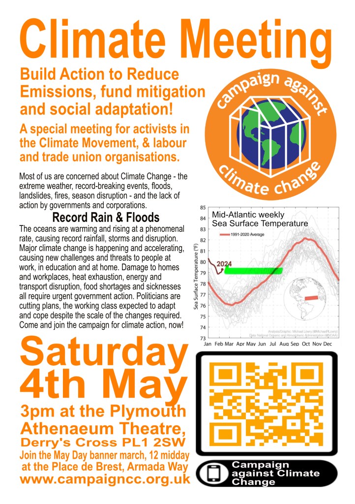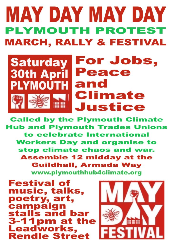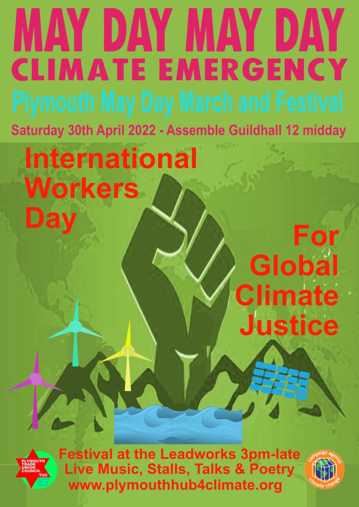 Come to our meeting for International Workers Day, on Saturday 4th May at 3pm at the Athenaeum Theatre, Drake’s Circus, Plymouth. Stop the Climate Denial! Build the demand for Climate Justice! In association with Plymouth Trades Union Council.