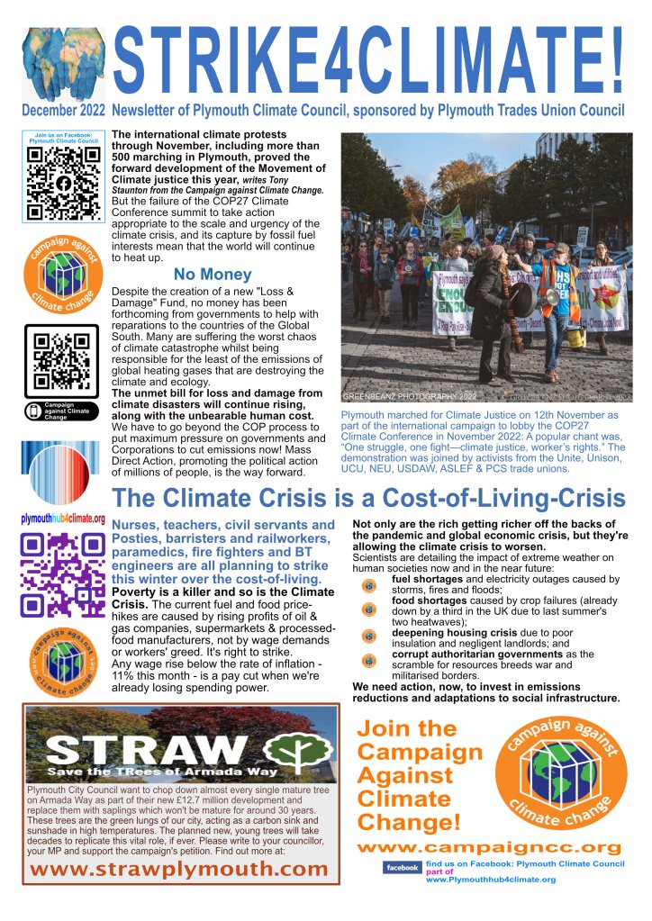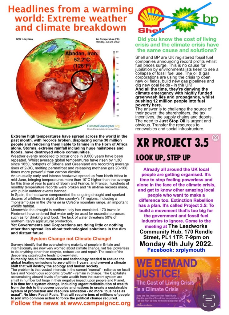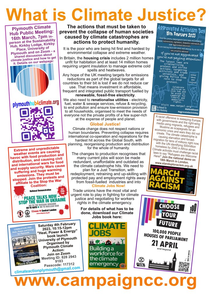 Formed to support the COP26 International Coalition in 2021, we continue as part of the international Climate Justice Coalition to build grassroots agitation in Plymouth & surrounding areas, to force Politicians and Corporations to reduce global heating emissions by at least 45% by 2030, and zero carbon emissions by 2035! The world faces climate catastrophe unless there is global action now.