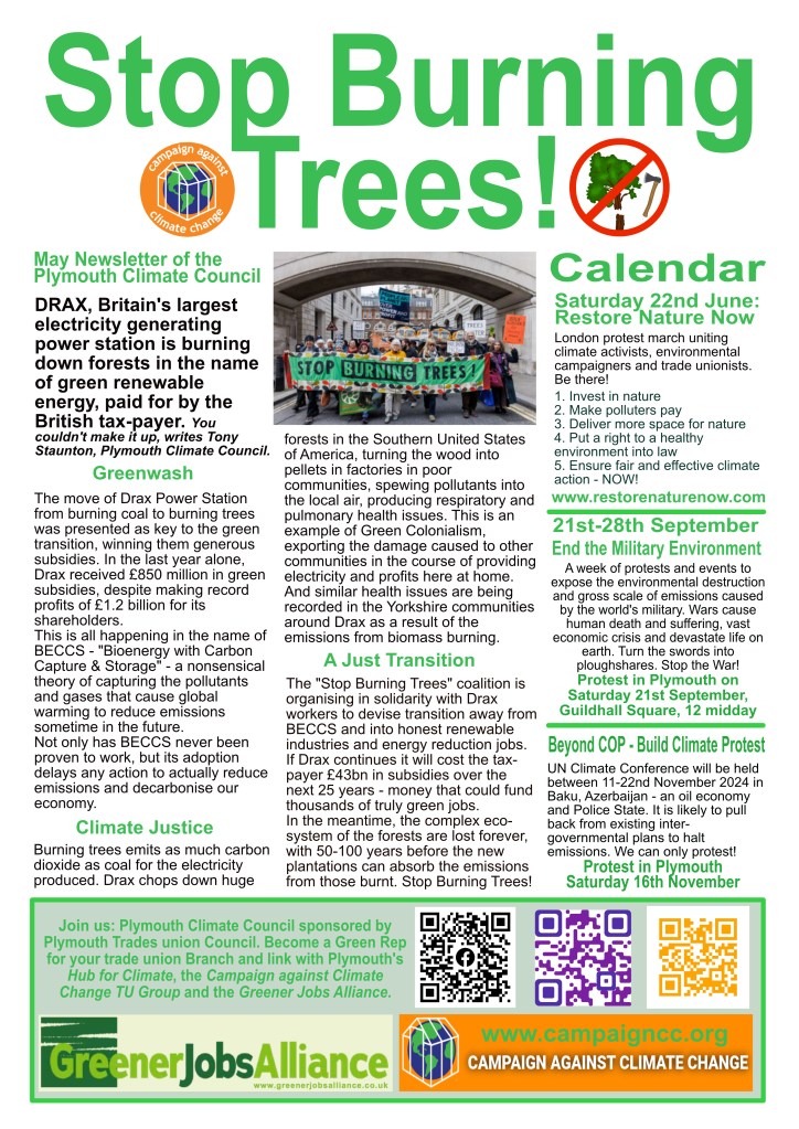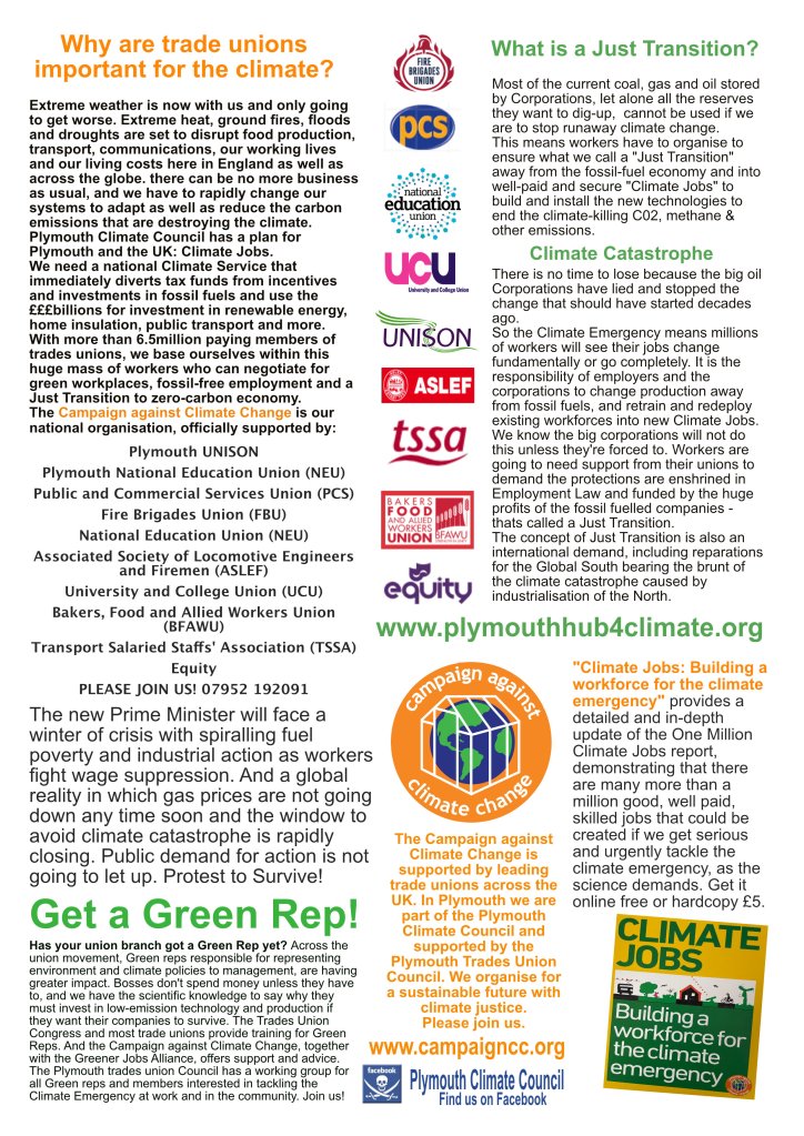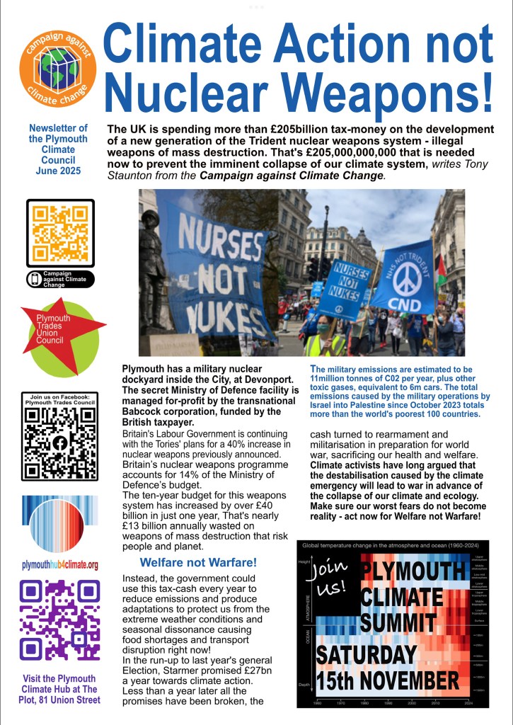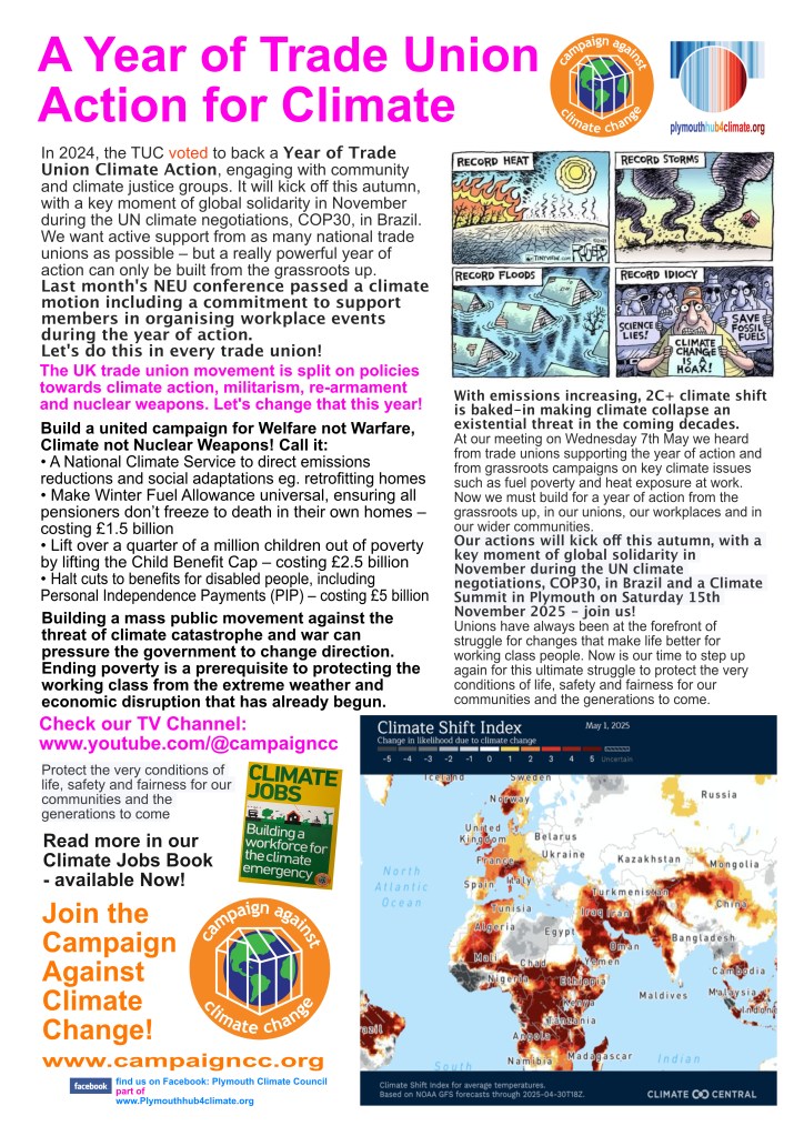 if you appreciated the day, please donate towards the help with the costs of the event (payable to Plymouth Trades Union Council, reference Climate Summit), by BACS: Plymouth & District Trades Union Council”, Unity Trust Bank, Ac 59110491 Code 08-60-01 ). We will be holding another Climate Summit on Saturday 15th November 2025 and a fortnight of events and actions coinciding with COP30.