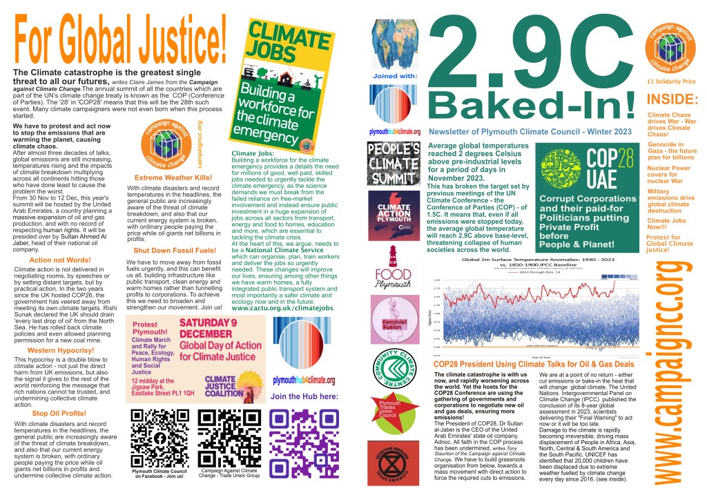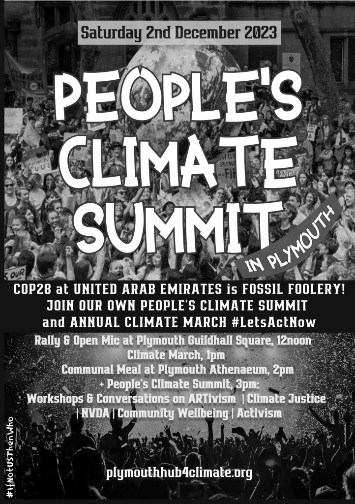 We organised a mass protest march and a Climate Summit of all organisations and activists in Plymouth on Saturday 2nd December – the start of COP28. And we’ll do it again next year! For more information email us at plymouthhub4climate@gmail.com