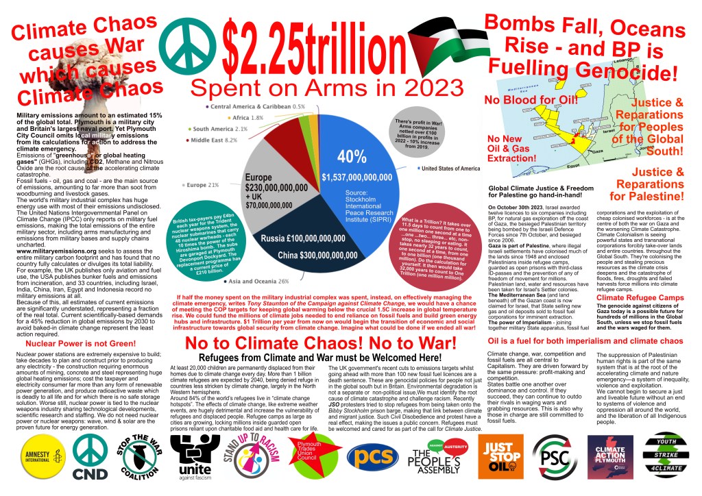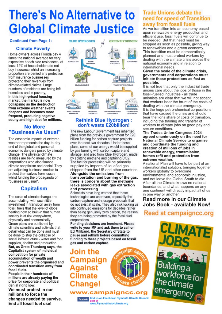 The COP29 Climate Conference in November 2024 was a travesty of injustice with no agreement on the decisions that can save hundreds of millions of people from climate catastrophe. We continue to organise in Plymouth as part of the international movement for climate justice, organising for protest at COP30 in November 2025.