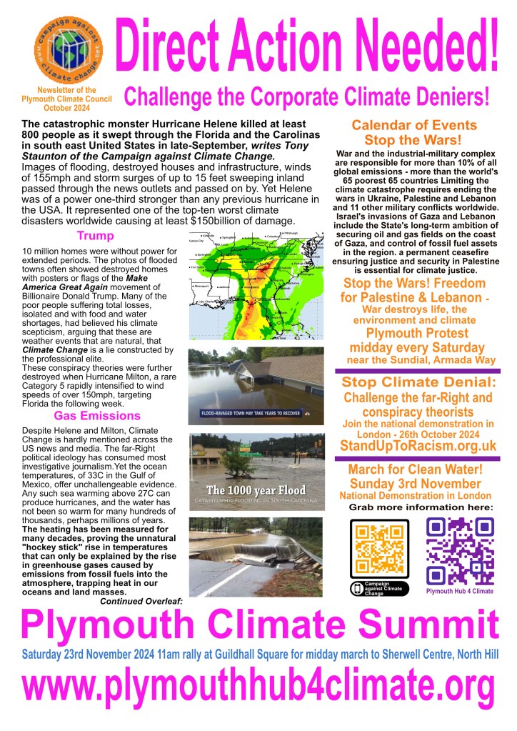 Thanks to everyone who supported our protest march on Saturday 23rd November 2024 and the Climate Summit at Sherwell Centre, North Hill, Plymouth. We discussed the corruption and hypocrisy of COP29 held in Baku, Azerbaijan, an oil-producing police state dominated by the petroleum company, BP. Globally, we ensured our voices were heard, including from Plymouth!