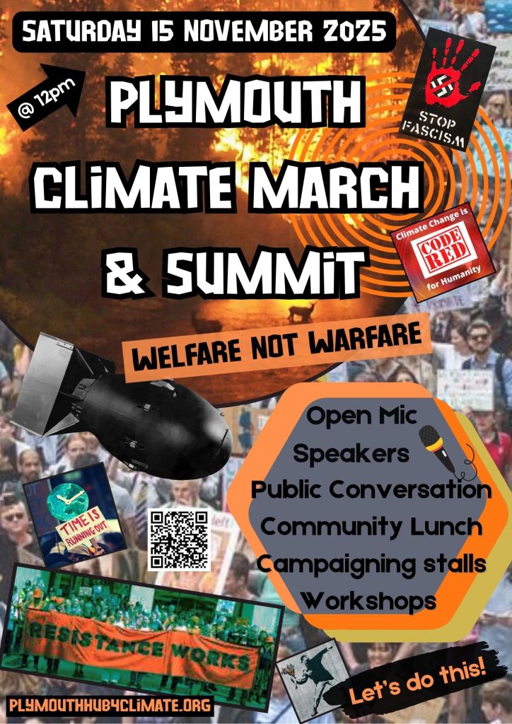 Join our protest march assembling at Guildhall Square on Armada Way at 11am, and Climate Summit on Saturday 15th November 2025 at the Sherwell Centre, North Hill, Plymouth, beginning with a free lunch at 1pm followed by 6 workshops to choose from, 2-6pm along with climate campaign stalls and continuous refreshments!