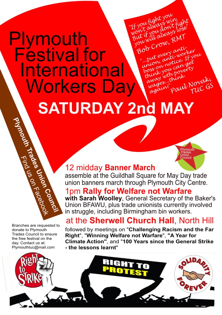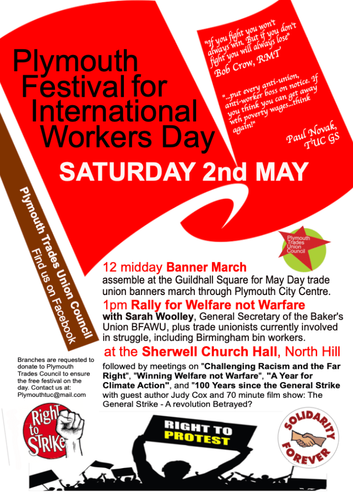 Join us on the May Day Banner March through Plymouth, 12 midday on Saturday 2nd May 2026 and visit our stall at the May Day Festival a the May Day Festival, from 1pm on Saturday 2nd May at the Sherwell Church Hall, North Hill, Plymouth.