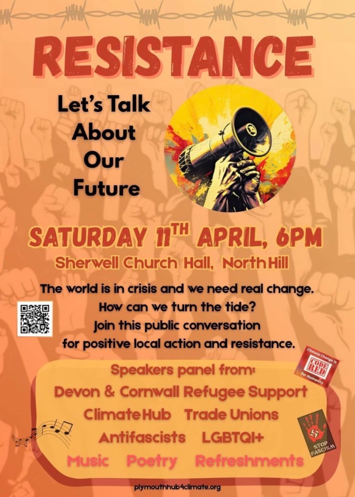 Saturday 14th April 2026 from 6pm at the Sherwell Church Hall, North Hill Plymouth. We’ll begin with lovely poetry and music, followed by a panel of experienced activists, and we’ll end with a conversation together. We’ll have tea and cakes too!