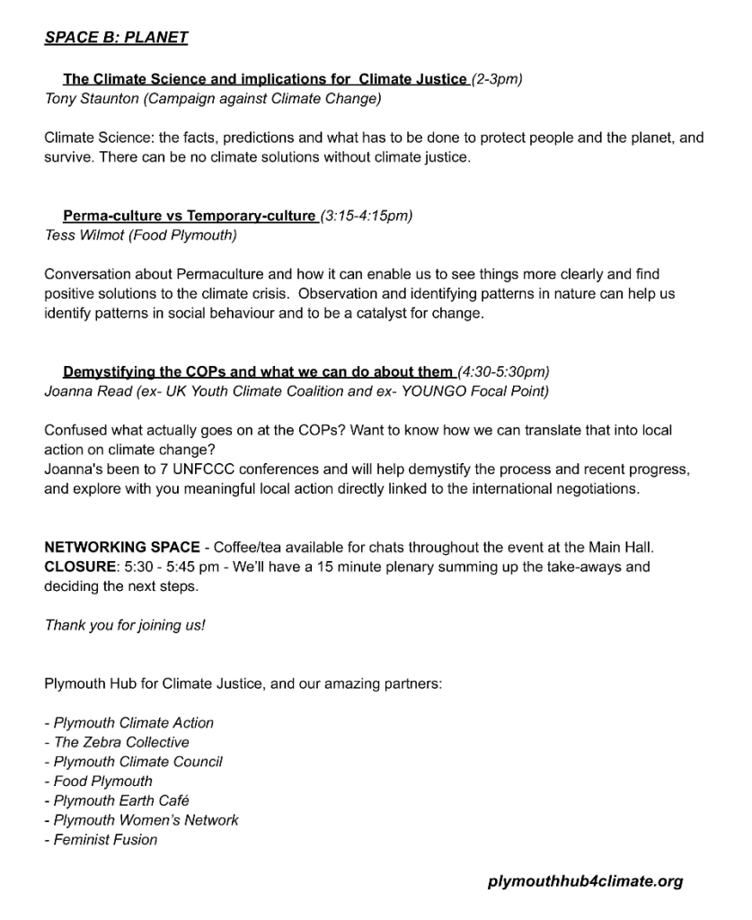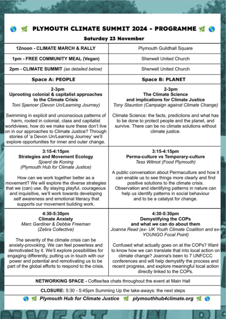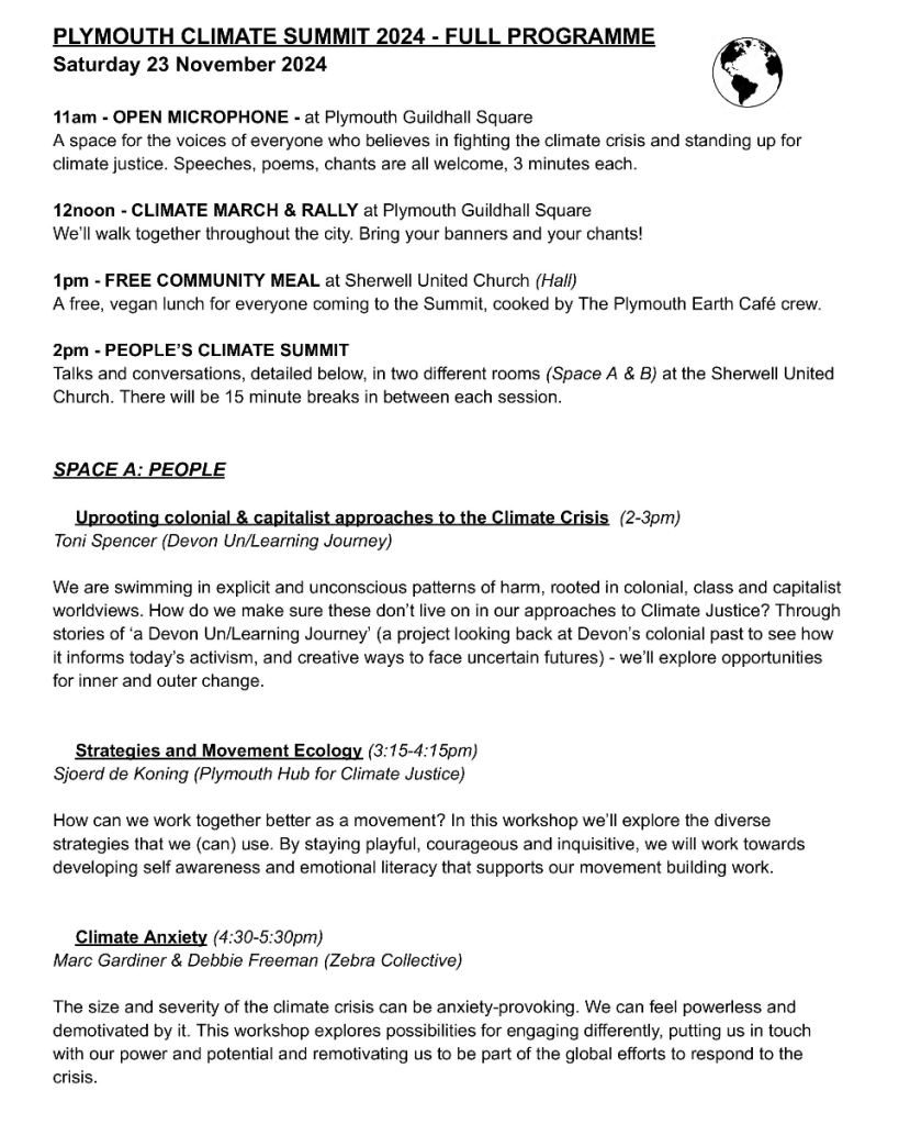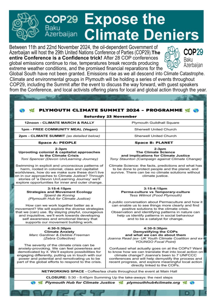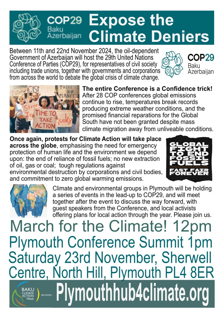 Please offer support from your organisation, including donations where possible towards the costs of the event (payable to Plymouth Trades Union Council, reference Climate Summit, by BACS: Plymouth & District Trades Union Council”, Unity Trust Bank, Ac 59110491 Code 08-60-01 ).
